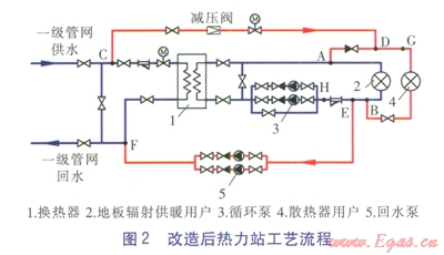 熱力站一級(jí)側(cè)供、回水溫度為100、60℃,改造前熱力站二級(jí)側(cè)(僅有地板輻射供暖用戶(hù))供、回水溫度為50、40℃,擬增加的散熱器用戶(hù)供回水溫度為80、60℃。改造前后熱力站工藝流程分別見(jiàn)圖1、2。由圖1、2可知,改造后,散熱器用戶(hù)一部分供水由換熱器二級(jí)側(cè)供水管道引出,另一部分供水由換熱器一級(jí)側(cè)供水管道引出。由一級(jí)側(cè)供水管道引出的熱水經(jīng)減壓閥、電動(dòng)調(diào)節(jié)閥后,與由二級(jí)側(cè)供水管道引出的熱水混合,作為散熱器用戶(hù)的供水。散熱器用戶(hù)回水與地板輻射供暖用戶(hù)回水混合后,一部分回到換熱器二級(jí)側(cè)回水管道,另一部分回到一級(jí)側(cè)回水管道。改造后二級(jí)側(cè)補(bǔ)水可由一級(jí)側(cè)補(bǔ)充,因此二級(jí)側(cè)原有補(bǔ)水裝置(補(bǔ)水泵、水處理裝置等)可取消?;厮昧髁颗c管道CD流量一致。經(jīng)校核,新增散熱器用戶(hù)的流量未超出循環(huán)泵的裕量,不影響地板輻射用戶(hù)流量。