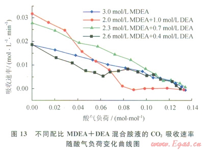 圖l2為不同配比MDEA+DEA混合胺液的CO2吸收速率變化曲線,圖l3為不同配比MDEA+DEA混合胺液的CO2吸收速率隨酸氣負(fù)荷變化曲線。如圖l2、13所示,隨吸收反應(yīng)的進(jìn)行、酸氣負(fù)荷的增加,4種配比MDEA+DEA混合胺液的CO2吸收速率逐漸降低,最終趨近于0,MDEA/DEA配比為2.6/0.4混合胺液的CO2吸收速率變化趨勢與MDEA胺液非常接近。按初始時刻CO2吸收速率由大到小的MDEA/DEA配比順序?yàn)?span lang="EN-US">2.0/1.0、2.3/0.7、2.3/0.4、3.0/0.0、2.0/1.0、2.3/0.7,這2種配比混合胺液的CO2吸收速率隨時間降低趨勢較為劇烈,吸收達(dá)到平衡的時間較短;2.3/0.7配比混合胺液在同一酸氣負(fù)荷下的CO2吸收速率始終高于MDEA單一胺液;2.0/1.0配比混合胺液在酸氣負(fù)荷較低時保持較高水平的CO2吸收速率,但隨著酸氣負(fù)荷的增大迅速降為0。