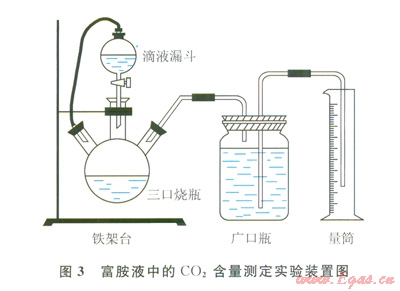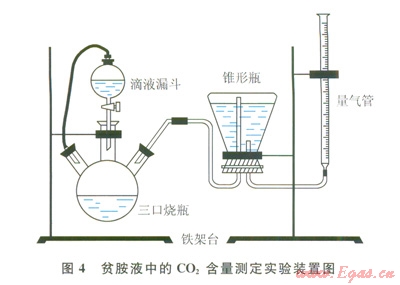 圖3、4分別為富胺液、貧胺液中的CO2含量檢測裝置,胺液樣品中CO2含量使用酸解法測得坫]。酸解法主要利用強(qiáng)酸置換弱酸的原理,用強(qiáng)酸H2SO4將CO2從胺液中置換出來,通過測定放出的CO2氣體體積計(jì)算溶液對CO2的吸收量。