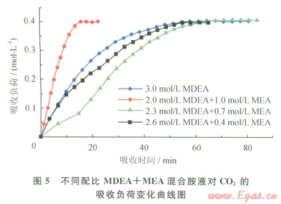2)MDEA/DEA配比為2.0/1.0時CO2吸收反應(yīng)很快達(dá)到平衡,但該配比在酸氣負(fù)荷較高的條件下CO2吸收速率較低;MDEA/DEA配比為2.6/0.4的混合胺液較MDEA,一胺液對CO2的吸收性能并無改善作用;2.3/0.7配比的MDEA+DEA混合胺液對CO2的吸收負(fù)荷與CO2吸收速率均保持較高水平。