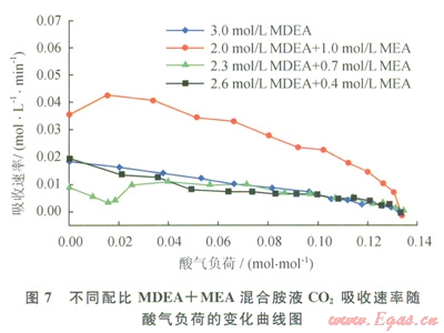 圖6為不同配比MDEA+MEA混合胺液CO2吸收速率的變化曲線圖,圖7為不同配比MDEA+MEA混合胺液CO2吸收速率隨酸氣負(fù)荷的變化曲線。從圖6、7可以看出,不同配比MDEA+MEA混合胺液隨吸收反應(yīng)的進(jìn)行,酸氣負(fù)荷逐漸增大,CO2吸收速率逐漸減小至0。MDEA/MEA配比為2.0/1.0的混合胺液CO2吸收速率明顯高于其他配比混合胺液;MDEA/MEA配比為2.3/0.7和2.6/0.4的混合胺液CO2吸收速率變化趨勢非常接近,與MDEA單一胺液CO2吸收速率相差不大。由此說明,2mol/L的MDEA溶液中加入1mol/L的MEA,其CO2吸收性能顯著提高,MEA添加量較小時對MDEA的CO2吸收性能并無改善。因此,MEA作為MDEA的添加劑時,需要較高MEA/MDEA配比才能使混合胺液表現(xiàn)出更好的CO2吸收性能。