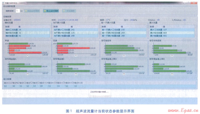 計量結(jié)果及當前狀態(tài)參數(shù)模塊主要顯示計量設備的當前狀態(tài)參數(shù)。狀態(tài)參數(shù)可根據(jù)要求分別以柱狀圖、數(shù)字或兩者結(jié)合的形式顯示,監(jiān)控人員可以直觀地觀測計量設備當前運行狀態(tài)是否正常。當狀態(tài)參數(shù)出現(xiàn)異常時,相應的圖形(或數(shù)字)以紅色顯示(正常時以綠色顯示),以提醒監(jiān)控人員注意。超聲波流量計當前狀態(tài)參數(shù)顯示界面見圖l。