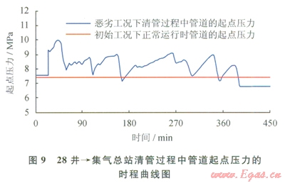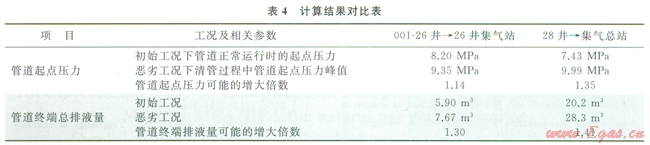 由表4與圖8、9可知,當(dāng)管內(nèi)氣相流速與氣液比均減小時(shí),清管過程中管道的起點(diǎn)壓力峰值和終端排液量均將增大,但不同管道的增大幅度并不一致,體現(xiàn)出的基本規(guī)律為:管道越長或高程差越大,清管中管道的起點(diǎn)壓力峰值和終端排液量增大幅度越大。其中,對(duì)管道較長高程差較大的28井®集氣總站管道而言,在管道運(yùn)行到后期可能遇到的惡劣工況下清管過程中管道起點(diǎn)壓力將比管道運(yùn)行初期正常運(yùn)行工況下的起點(diǎn)壓力增大1.35倍,而終端排液量則比管道運(yùn)行初期清管過程中的排液量增大1.41倍。