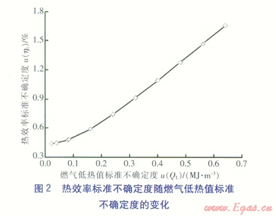 在所有輸入量標(biāo)準(zhǔn)測量不確定度中,由于進(jìn)出水溫度的標(biāo)準(zhǔn)不確定度以及燃?xì)獾蜔嶂档臉?biāo)準(zhǔn)不確定度對熱效率的標(biāo)準(zhǔn)不確定度的影響最大,因此有必要對兩者進(jìn)行深入分析。在分別改變進(jìn)出水溫度標(biāo)準(zhǔn)不確定度、燃?xì)獾蜔嶂禈?biāo)準(zhǔn)不確定度條件下,對熱效率標(biāo)準(zhǔn)不確定度的變化進(jìn)行計(jì)算(見圖1、2)。由圖1、2可知,進(jìn)出水溫度標(biāo)準(zhǔn)不確定度、燃?xì)獾蜔嶂禈?biāo)準(zhǔn)不確定度的改變對熱效率標(biāo)準(zhǔn)不確定度的影響很大。