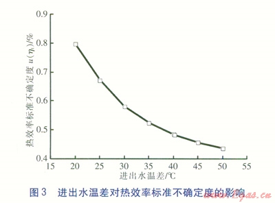 在實(shí)驗(yàn)過程中,GB 6932—2001對于熱效率測量中的水溫調(diào)節(jié)做了以下要求:調(diào)節(jié)出水溫度比進(jìn)水溫度高40℃±1℃,當(dāng)不能調(diào)節(jié)至此溫度時(shí),在熱水溫度可調(diào)范圍內(nèi),調(diào)至最接近的溫度。其他條件不變,不同進(jìn)出水溫差對熱效率標(biāo)準(zhǔn)不確定度的影響見圖3。由圖3可知,進(jìn)出水溫差越小,將會(huì)引起熱效率標(biāo)準(zhǔn)不確定度越大。在實(shí)驗(yàn)過程中,應(yīng)該盡量達(dá)到40℃的溫差,但是進(jìn)出水溫差也不能過大,這對熱水器熱效率將會(huì)造成影響,因此在相關(guān)標(biāo)準(zhǔn)制定中,應(yīng)該綜合考慮確定具體的進(jìn)出水溫差。