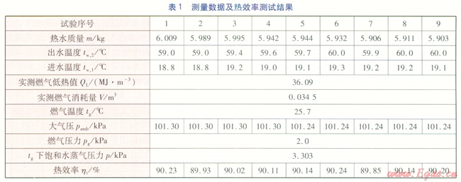 選取一臺(tái)額定熱功率為20kW的熱水器,燃?xì)夥N類為12T天然氣。執(zhí)行GB 6932—2001對測試的要求,對熱水器進(jìn)行熱效率的測定。共進(jìn)行9次測試,測量數(shù)據(jù)及熱效率測試結(jié)果見表1。
