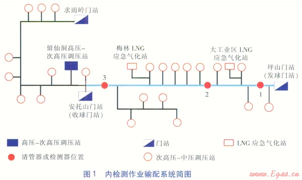調(diào)度中心收集、匯總現(xiàn)場信息,計算分析清管器或檢測器實時速度,調(diào)整供氣門站、LNG應急氣化站的流量,有效控制球速,滿足內(nèi)檢測作業(yè)的工藝要求。預測清管器或檢測器通過各分輸支線及收球門站的時間,提前通知廠站現(xiàn)場指揮組做好相應操作準備。通過調(diào)整清管器或檢測器的發(fā)球時間和速度,避免在供氣高峰時段關(guān)停重要的調(diào)壓站而影響下游供氣。在清管器或檢測器卡堵的應急情況下,進行管網(wǎng)運行工況調(diào)整及供氣保障的氣量調(diào)度。