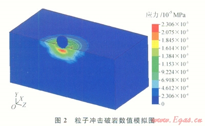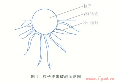 1)高速的粒子沖擊到巖石的表面后,接觸應力繼續(xù)增加時,會在接觸面附近的巖石內部產生剪切應力和拉伸應力,當粒子沖擊產生的拉應力和剪應力大于巖石的抗拉和抗剪強度后,破碎的裂紋開始產生。粒子以100m/s以上的速度沖擊巖石,粒子含量為2%時,粒子沖擊的頻率每分鐘達500萬次。