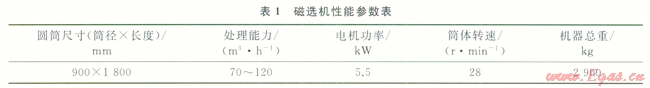 代入數(shù)據(jù)得滾筒半徑為0.145m,則滾筒的直徑為290mm,磁鼓的線速度為228.6m/min。設汁的磁選機滾筒直徑為900mm,滾筒最大轉速為40r/min。磁選機的性能參數(shù)如表1所示。