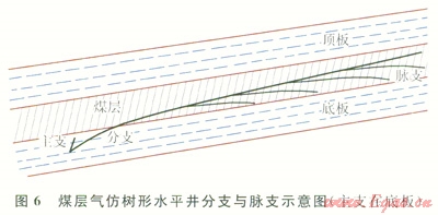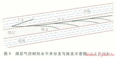 3)在每個(gè)分支上側(cè)鉆若干脈支(一般3~8個(gè)),脈支在煤層內(nèi),以溝通煤層內(nèi)裂隙為主要目的,不出煤層,長(zhǎng)度一般50~400m,不求長(zhǎng),但數(shù)量盡可能多,以增大煤層氣解析面積(圖5)。