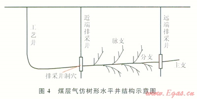 3)脈支是該系統(tǒng)產(chǎn)氣的主要來(lái)源,鉆穿煤層內(nèi)夾矸層,以溝通煤層內(nèi)裂隙為主要目的,不要求長(zhǎng)度,但其數(shù)量盡可能多,以增大泄氣通道。