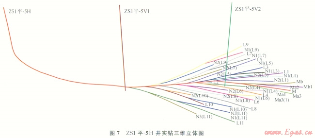 ZSl平-5H井是中國(guó)石油華北油田公司在山西沁水盆地的第1口煤層氣仿樹(shù)形水平井先導(dǎo)試驗(yàn)。由1口工藝井(ZSl平-5H井)和1口排采直井(ZSl平-5H井)、1口監(jiān)測(cè)井(ZSl平-5H井)組成(圖7),工藝井主支設(shè)置在煤層頂板泥巖中,距煤層頂部保持適當(dāng)距離(一般控制在0.5~3m),不觸媒;排采井、監(jiān)測(cè)井在煤層頂板造洞穴,洞穴底部距離煤層1m,直徑0.6m,高度6m。