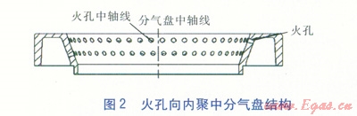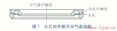 改變原來的火孔向外散開分氣盤結(jié)構(gòu),將分氣盤設(shè)計(jì)成火孔向內(nèi)聚中分氣盤,即火孔分布在分氣盤內(nèi)側(cè)邊緣。在火孔排布時,分氣盤應(yīng)采用上下兩排火孔,兩排火孔的中軸線均與分氣盤的中軸線錯開,且火孔中軸線與水平面成一定角度,這樣的火孔稱為旋火火孔。旋火火孔產(chǎn)生的火焰圍繞分氣盤的中軸線呈盤繞狀,比直火火孔(火孔的中軸線與分氣盤的中軸線相交)更能產(chǎn)生渦流形成負(fù)壓,卷入更多的二次空氣,加速燃?xì)馀c二次空氣的再混合,并推動高溫?zé)煔饴菪仙?,燃燒更聚中、充分,增?qiáng)了高溫?zé)煔馀c鍋底的熱交換,減少了熱損失,從而提高了熱效率。火孔向外散開分氣盤結(jié)構(gòu)見圖1,火孔向內(nèi)聚中分氣盤結(jié)構(gòu)見圖2。