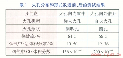 將傳統(tǒng)燃?xì)庠畎凑丈鲜龇椒ㄟM(jìn)行火孔分布和形式的改進(jìn),在鍋支架高度均為30mm、排煙間隙為30mm,未加裝半封閉燃燒室的情況下進(jìn)行測試,改進(jìn)前、后的測試結(jié)果見表1。在表1~4中,CO體積分?jǐn)?shù)是指標(biāo)準(zhǔn)狀態(tài)下、過??諝庀禂?shù)為1時的折算值。