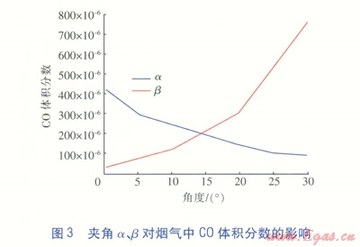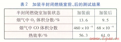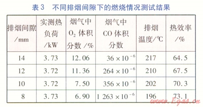 通過測試可知,排煙間隙小于10mm時,由于排煙阻力增大,不利于一次空氣與二次空氣的供給,造成燃燒不完全,CO排放超標(biāo)。而排煙間隙為10mm時,熱效率可達(dá)70%以上,CO排放量也在標(biāo)準(zhǔn)要求的范圍之內(nèi)。因此排煙間隙為10mm最為理想。