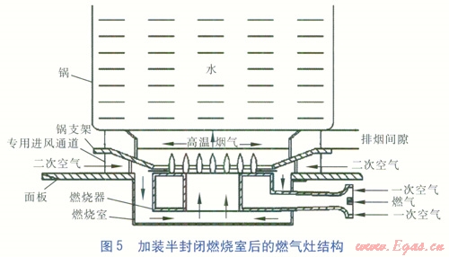 因此燃燒器應(yīng)當(dāng)放置在半封閉的燃燒室內(nèi),通過設(shè)計(jì)專用空氣通道供給燃燒所需空氣,實(shí)現(xiàn)空氣與煙氣分離,使燃燒系統(tǒng)達(dá)到一個穩(wěn)定的燃燒狀態(tài),減少煙氣帶走的熱量損失,從而提高燃?xì)庠畹臒嵝省?span lang="EN-US">
