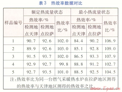 表3列出了5臺樣機(jī)分別在拉薩地區(qū)及天津地區(qū)測得的額定熱流量與最小熱流量狀態(tài)的熱效率對比數(shù)據(jù)。