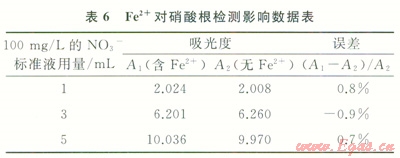 在50mL容量瓶中配制不同濃度NO3-標準溶液,一組加入1mL的100mg/L Fe2+標準液作對照,測得的NO3-吸光度如表6所示。