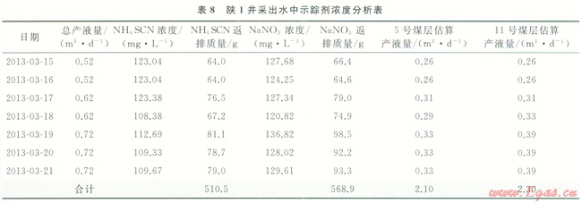 2012年12月對陜1井進行了分層壓裂施工,11號煤壓裂注入壓裂液1153m3,加入NaNO3 500kg,示蹤劑NaNO3在單層壓裂液中的平均濃度約為430mg/L;5號煤壓裂,注入壓裂液1135m3,加入NH4SCN 500kg,示蹤劑NH4SCN在單層壓裂液中的平均濃度約為440mg/L。壓裂施工完成后,于2013年3月10日開始進行排采,2013年3月15日開始連續(xù)一周每天取樣進行室內(nèi)檢測,按照前面實驗室分析方法分析SCN-和NO3-測得采出水中兩種示蹤劑的含量如表8所示。