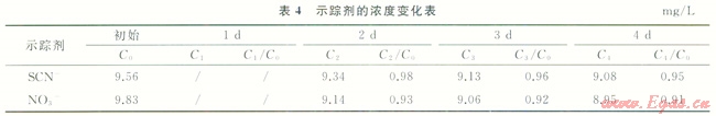 根據(jù)表4結(jié)果表明,煤粉對SCN-和NO3-雖具有一定的吸附作用,但每天Ci/C0的值遞減較慢,4d后Ci/C0均大于0.8,滿足示蹤劑靜態(tài)吸附實驗要求。