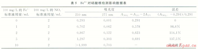 由表5結(jié)果表明:不加Fe3+時,NO3-標準液因不含有機物,在275nm處幾乎無吸收,加入Fe3+標準液后,溶液在210nm、275nm處吸光度明顯提高,這說明Fe3+在210nm、275nm處均有強烈吸收,對NO3-的測定結(jié)果影響較大,能使測定結(jié)果大大增加。