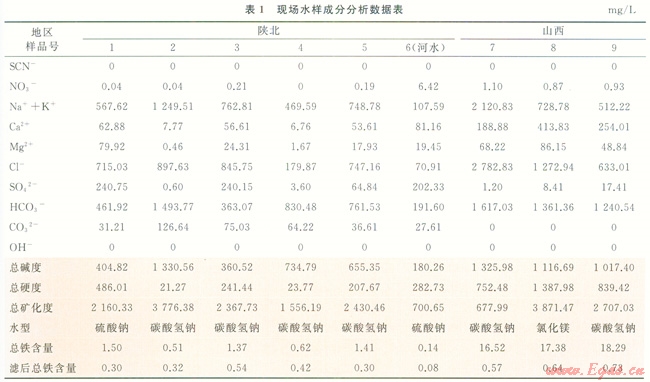 將現(xiàn)場所取回的2個區(qū)塊的8個水樣和1個壓裂液配水樣品進行常規(guī)水質(zhì)分析[5],同時進行了SCN-[6]和NO3-[7]的檢測。實驗結(jié)果如表l所示。