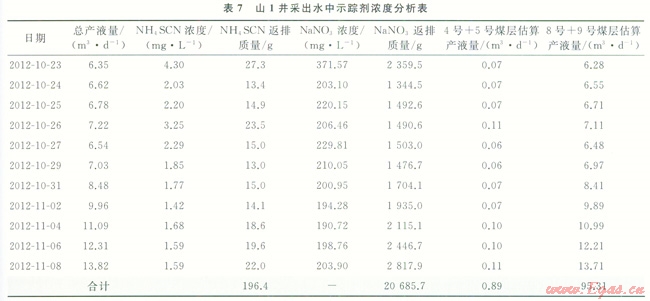 2012年5月對山1井2個層進行了壓裂施工,8號+9號煤層注入壓裂液975.6m3,加入NaNO3 500kg,示蹤劑在單層壓裂液中的平均濃度約為510mg/L;4號+5號煤層注入壓裂液1003.5m3,NH4SCN用量500kg,示蹤劑在單層壓裂液中的平均濃度約為500mg/L。施工完成后,關(guān)井擴散壓力。油嘴控制排液,無液體返出。同年10月17日進行排采,10月23日開始對采出液進行采樣分析,17d內(nèi)取了11個樣,按照前面實驗室分析方法分析SCN和NO3-(除鐵,扣減SCN吸光度的方法進行修正),采出水中各種示蹤劑的含量如表7數(shù)據(jù)所示。