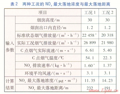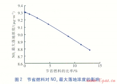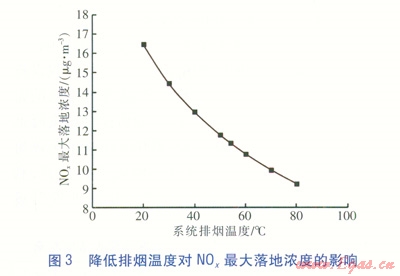 綜合分析正負兩方面因素,排煙溫度降低對NOx最大落地濃度的影響要比燃料的節(jié)省對NOx最大落地濃度的影響更為顯著,說明排煙溫度降低是主要影響因素,綜合起來NOx最大落地濃度是隨著煙氣溫度的降低逐漸增大的。