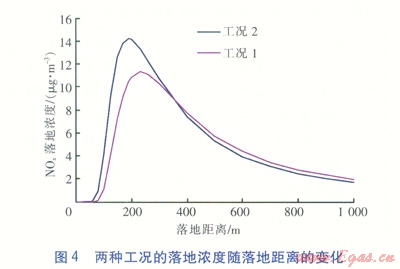 表2中木表示折算值,是將工況1排放量折算到與工況2相同供熱量條件下的數據。標準狀態(tài)是指101325Pa、0℃,工況1煙氣排放量對應狀態(tài)為101360Pa、54.1℃,工況2煙氣排放量對應狀態(tài)為101310Pa、22.3℃。NOx最大落地濃度和最大落地距離見表2。落地濃度隨落地距離(落地處與煙囪的距離)的變化見圖4。