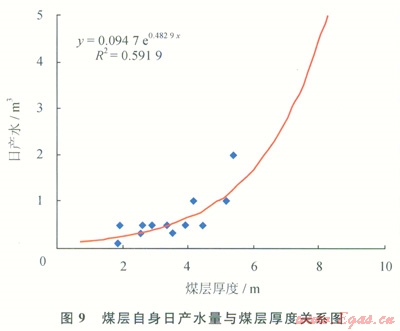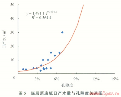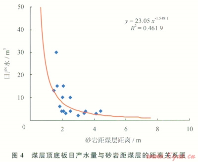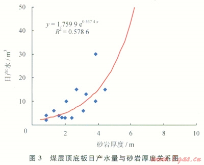 煤層直接頂?shù)装鍨樯皫r時,物性較好,且砂巖厚度越大,則頂?shù)装迳皫r的含水性越強(qiáng),煤層壓裂后頂?shù)装迳皫r的地層水易于產(chǎn)出,排采出水量亦較大。如果砂巖為老頂?shù)祝苯禹數(shù)装宓哪鄮r較薄,壓裂時容易壓穿直接頂?shù)装宓哪鄮r,致使壓裂縫溝通了老頂?shù)椎纳皫r而增大出水量,且隨著砂巖距煤層越近,越易于壓穿直接頂而溝通砂巖含水層,為此,頂?shù)装迳皫r的厚度、孔隙度及距煤層的距離與煤層排采出水量有較大的關(guān)系。