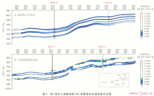 測(cè)井曲線分析表明,煤層縱波阻抗明顯低于砂泥巖,因而可以應(yīng)用聲波阻抗反演方法預(yù)測(cè)煤層厚度。但由于該區(qū)煤層厚度薄、不同井間厚度變化大,為提高薄煤層分辨能力,在縱波阻抗反演基礎(chǔ)上應(yīng)用地質(zhì)統(tǒng)計(jì)學(xué)反演得到了比較好的效果,從圖3中可以看出地質(zhì)統(tǒng)計(jì)學(xué)反演結(jié)果對(duì)薄煤層(藍(lán)色為雕刻出的煤層)反映特別清晰,與井吻合性更好,由此獲得的煤層厚度預(yù)測(cè)平面圖精度更高。
