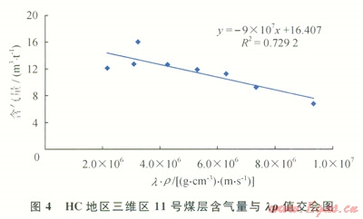 煤層含氣性預(yù)測(cè)的基礎(chǔ)是測(cè)井曲線分析。通過對(duì)研究區(qū)內(nèi)所收集到的井的含氣量與彈性參數(shù)交會(huì)分析(圖4)得到,該區(qū)11號(hào)煤層的含氣量隨密度、縱波速度、縱橫波速度比、lr值增大而減小,同時(shí)按線性關(guān)系擬合儲(chǔ)層含氣量與lr值之間的數(shù)學(xué)關(guān)系,相關(guān)系數(shù)為0.7292,認(rèn)為兩者的線性關(guān)系有一定的可靠性,可以用lr值來(lái)指示含氣量的變化,lr小值對(duì)應(yīng)含氣量的大值。