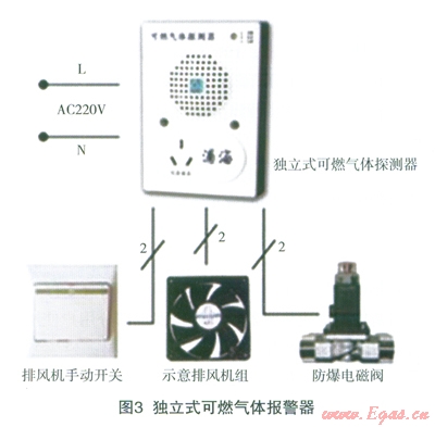 單一報(bào)警功能的報(bào)警器:它能在傳感器周圍燃?xì)鉂舛冗_(dá)到一定數(shù)值時(shí)嗚叫或者發(fā)光報(bào)警,提示家庭用戶及時(shí)采取措施。這種報(bào)警器的特點(diǎn)是價(jià)格較低,安裝簡(jiǎn)便,無需改造燃?xì)庀到y(tǒng),因此適用于老舊小區(qū)。另一類為帶信號(hào)輸出功能的報(bào)警器,如圖3所示。這種報(bào)警器可以驅(qū)動(dòng)電磁閥在報(bào)警的同時(shí)及時(shí)切斷燃?xì)馔ǖ?,或者控制排風(fēng)扇、抽油炯機(jī)強(qiáng)制排風(fēng),但其安裝相對(duì)復(fù)雜。