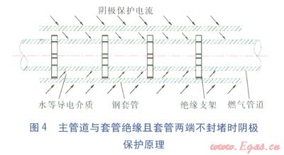 ③不可避免加設(shè)套管時(shí),套管兩端可不必密封防水材料,只要在主管道與套管之間充填柔軟材料防止沙石進(jìn)入對(duì)防腐層起破壞作用即可。因?yàn)楫?dāng)套管內(nèi)有水或泥土存在時(shí),能起到導(dǎo)電介質(zhì)的作用,陰極保護(hù)電流通過介質(zhì)形成回路,不會(huì)被屏蔽。套管可視為土壤介質(zhì)的一部分,陰極保護(hù)電流從套管外壁流入,從套管內(nèi)壁流出,再從主管道外部流入,主管道將受到很好的陰極保護(hù)[2]。如果套管與主管道間有特定性能的電解質(zhì)物質(zhì),導(dǎo)電性能會(huì)更好,主管道陰極保護(hù)的效果會(huì)更好,其原理見圖4。