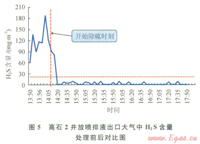 含硫井排出液自動(dòng)實(shí)時(shí)處理流程(圖4)和]二藝技術(shù)目前已經(jīng)在川渝地區(qū)多口井開展應(yīng)用,效果顯著(圖5),如高石2井在排液期間,采用該技術(shù)對井筒產(chǎn)出液進(jìn)行處理前,放噴出口大氣環(huán)境中H2S含量主要維持在115~173mg/m3范圍內(nèi),而應(yīng)用該技術(shù)后,放噴出口大氣環(huán)境中H2S含量降低到8.65mg/m3以內(nèi),可以滿足井場人員連續(xù)作業(yè)的要求。
