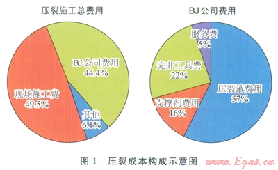 眾所周知,非常規(guī)油氣開發(fā)的經(jīng)濟(jì)效益取決于成本的控制,北美取得頁巖氣開發(fā)的成功正是由于采用了低成本的清水壓裂[4]。但以勝利油田某非常規(guī)頁巖油氣井的壓裂開采預(yù)算為例(圖1),不難看出,國外公司的完井工具、壓裂材料(壓裂液和支撐劑)以及技術(shù)服務(wù)費(fèi)用占據(jù)全部壓裂費(fèi)用的44.4%,其中,壓裂液的費(fèi)用又占BJ公司全部預(yù)算的57%。兇此,目前的非常規(guī)油氣開發(fā)模式難以取得經(jīng)濟(jì)效益,從長遠(yuǎn)角度出發(fā),必須要有大量的資金和科研力量投入到非常規(guī)油氣開采的基礎(chǔ)研究上,從完井工具、壓裂液和支撐劑以及相關(guān)技術(shù)上打破國外技術(shù)壟斷。提升壓裂開采的軟件實(shí)力,才能有效控制開發(fā)成本,取得并提高經(jīng)濟(jì)效益。