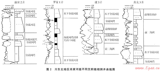 對于川東北須家河組沉積相的劃分,筆者在前人對四川盆地須家河組研究的基礎(chǔ)上,通過對研究區(qū)及鄰區(qū)野外實測地質(zhì)剖面的分析,結(jié)合對實鉆資料(巖心資料、錄井資料、分析化驗資料)等的綜合研究,利用沉積巖的巖石學特征、沉積構(gòu)造與沉積韻律組合,借助測井資料電性特征和測井響應等手段,主要運用測井相方法對主要儲集層沉積相進行分析。經(jīng)過研究發(fā)現(xiàn),區(qū)內(nèi)須家河組主要發(fā)育辮狀河三角洲沉積體系,進一步可劃分為三角洲平原、三角洲前緣和前三角洲3類亞相,前兩項又可細分為分流河道、分流間灣、間灣沼澤、水下分流河道和前緣席狀砂5種微相。
