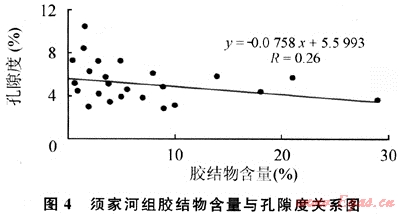 2) 膠結(jié)作用。膠結(jié)作用往往造成儲層孔隙度的降低(圖4)。研究區(qū)膠結(jié)作用類型主要為石英膠結(jié)。須家河組為一套煤系地層,早期水介質(zhì)條件為酸性,有利于石英沉淀。因此,在早成巖階段,可產(chǎn)生少量石英次生加大邊,此時石英顆粒的周圍自由空間充分,石英可以通過次生加大增生恢復晶體的自形,這是早成巖期石英加大的特征。進入晚成巖期,有機質(zhì)開始進入成熟階段,產(chǎn)生大量有機酸,pH值降低,硅質(zhì)膠結(jié)物開始普遍沉淀,石英次生加大膠結(jié)物表現(xiàn)為充填剩余的孔隙空間損失量為3%~5%。