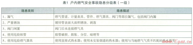 以筆者所在單位為例,目前將戶內(nèi)燃?xì)獍踩[患分為三級,一級隱患風(fēng)險等級最高,共5類,如表l所示。