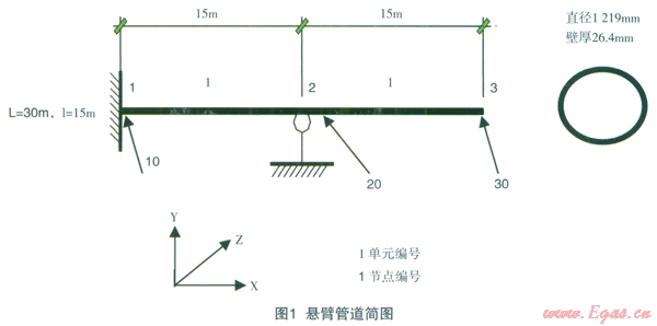 大口徑、厚壁管道,是指鋼管外徑和壁厚之比小于20的鋼管,廣泛應(yīng)用于自來水、天然氣、石油、化工、醫(yī)藥、通訊、電力、海洋工程等領(lǐng)域。其應(yīng)力分析主要是為了滿足管道設(shè)計(jì)強(qiáng)度和柔性要求,確保管道在各種工況下安全運(yùn)行,而載荷是導(dǎo)致管道內(nèi)產(chǎn)生應(yīng)力的基本原因。大口徑、厚壁管所受的載荷按照載荷性質(zhì)可分為靜載荷、動(dòng)載荷和溫度載荷。為了便于分析,本文只研究管道所受的靜載荷,即對大口徑、厚壁管進(jìn)行靜力分析。該類管道的靜力分析主要有3類:一是壓力載荷和持續(xù)載荷作用下的管道一次應(yīng)力計(jì)算,為防止塑性變形破壞;二是管道熱脹冷縮以及端點(diǎn)附加位移載荷作用的管道二次應(yīng)力計(jì)算,為防止疲勞破壞;三是管系位移計(jì)算,為防止管道碰撞和支吊點(diǎn)位移過大。由于管路沿線的地貌復(fù)雜,引起管道應(yīng)力的因素較多,針對大口徑、厚壁管的應(yīng)力分析,我們主要考慮管系自重、內(nèi)壓和溫度3大要素。下面將以大口徑、厚壁管中的懸臂管道為例,對CAESARⅡ軟件應(yīng)用于這類管道的應(yīng)力分析作可行性研究。