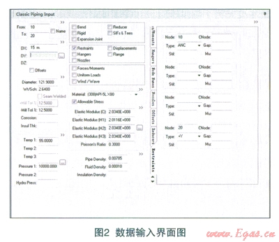 在應(yīng)用CAESARⅡ軟件計(jì)算時(shí),首先需要對管道進(jìn)行節(jié)點(diǎn)的選擇和編號;接著輸入數(shù)據(jù),輸入的數(shù)據(jù)按其特性不同分為管道元件結(jié)構(gòu)特征參數(shù)、基本參數(shù)和邊界條件3種類型。管道元件結(jié)構(gòu)特征參數(shù)主要是指管道元件的形狀、結(jié)構(gòu)特征等,這類參數(shù)決定了管道的空間走向和相應(yīng)的管道元件的規(guī)格尺寸、特性?;緟?shù)主要是指管道元件的計(jì)算溫度、安裝溫度,管道材料特性(彈性模量、線膨脹系數(shù)、許用應(yīng)力、管材密度)以及管道尺寸(外徑、壁厚、長度)等。邊界條件主要是指管道元件的約束條件、附加位移及管道端點(diǎn)類型等。