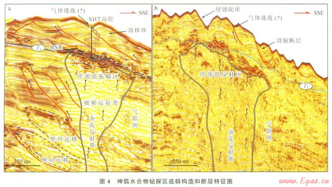 神狐水合物鉆探區(qū)內(nèi)沒有明顯的大尺度斷層,但是上新世地層中發(fā)育一些與氣煙囪相溝通正斷層(圖4-a)。這些斷層的存在為含氣流體的側(cè)向運移提供了通道,斷層附近存在的一些雜亂反射特征可作為流體發(fā)生短距離側(cè)向運移的證據(jù)(圖4-a)。此外,在更新世以來的地層中,鉆探區(qū)內(nèi)廣泛發(fā)育滑移沉積體(圖4-b)。在重力的誘導(dǎo)下,沉積層將順著滑脫斷層,沿著陸坡坡降的方向線由北向南發(fā)生整體的滑動。這些滑脫斷層呈雁列式排列,通??梢詼贤鉄焽韬秃5?/span>(圖4-b)?;摂鄬拥拇嬖谝环矫婵梢宰鳛榱黧w逃逸至海底的通道,另一方面也可為水合物的形成提供有限的空間,從而形成一些小規(guī)模的裂縫充填型水合物[19]。