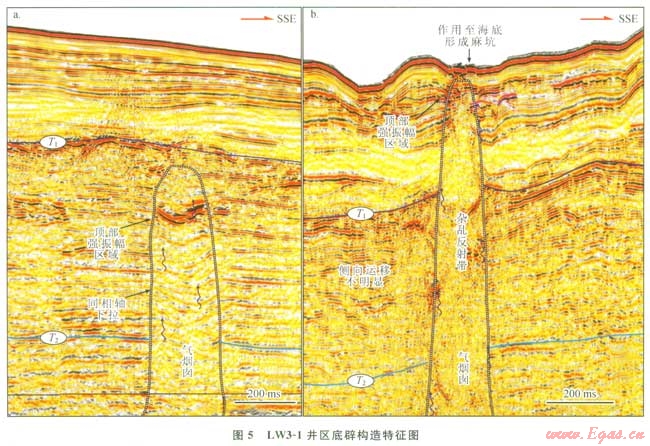 LW3-1井區(qū)的底辟構(gòu)造呈直立窄柱狀,一般不會引起周緣地層的向上牽引,且少有伴生斷層(圖5)。在這一區(qū)域的西南部發(fā)育有一個小型底辟構(gòu)造(氣煙囪),平面位置見圖3。地震剖面上可以觀察到內(nèi)部具有雜亂反射的特征,且局部存在著同相軸下拉的現(xiàn)象,這個小型的流體底辟可刺穿至海底,在海底表面可能導(dǎo)致了麻坑的形成(圖5-b)。
