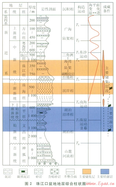 珠江口盆地是位于南海北部大陸架上的中、新生代沉積盆地。盆地呈NE方向展布,具有“三隆兩坳”的構(gòu)造格局,從北至南依次為北部斷階帶、北部坳陷帶、中央隆起帶、南部坳陷帶和南部隆起帶等5個一級構(gòu)造單元[7]。神狐水合物鉆探區(qū)和LW3-1井區(qū)均位于白云凹陷南側(cè)(圖1)。以區(qū)域“破裂不整合面——T7,界面”為界,珠江口盆地的構(gòu)造演化可劃分為兩個階段:斷裂階段和裂后階段[8]。同樣以T7界面為界,盆地垂向上構(gòu)成了下斷上坳的雙層結(jié)構(gòu)和先陸后海的沉積組合[9]。整個盆地的沉積充填為古新統(tǒng)—下統(tǒng)新統(tǒng)的沉積地層(包括神狐組、文昌組和恩平組),以及古新統(tǒng)—下漸新統(tǒng)的沉積地層(珠海組、珠江組、韓江組、粵海組和萬山組)。沉積環(huán)境也發(fā)生了由陸向海、水向深水、由過補償向欠補償?shù)难葑?/span>(圖2)。