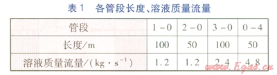 各管段長度、溶液質(zhì)量流量見表1。設定節(jié)點1~3處溶液溫度均為60℃,管段1-0、2-0、3-0溶液質(zhì)量分數(shù)分別為41%、38%、41%,環(huán)境溫度為5℃,各管段單位長度散熱系數(shù)均取2W/(m·K)。