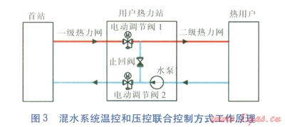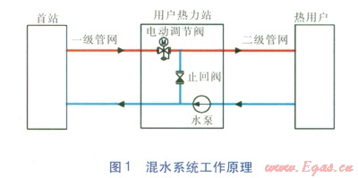隨著能源和環(huán)境問題日益突出,節(jié)能和環(huán)保引起全球關(guān)注,成為人類社會(huì)生存和發(fā)展的兩大主題?;焖到y(tǒng)作為一種更加節(jié)能的供熱方案,得到了日益廣泛的應(yīng)用。混水系統(tǒng)工作原理見圖1,將一級(jí)管網(wǎng)的高溫水和二級(jí)管網(wǎng)的低溫水在用戶熱力站不經(jīng)過換熱器按比例直接混合后供給熱用戶。