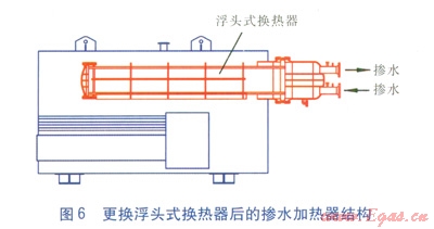 將原加熱盤管拆除(見圖4),更換成浮頭式換熱器(見圖5)。改造完畢后,按要求試壓。1臺摻水加熱爐安裝1臺浮頭式換熱器,另制造1臺浮頭式換熱器作為3臺摻水加熱爐的備用換熱器。當某臺浮頭式換熱器結(jié)垢嚴重,需要清垢時,先停爐拆下該浮頭式換熱器,更換上備用換熱器,然后摻水加熱爐繼續(xù)運行,從而減輕對正常運行的影響。更換浮頭式換熱器后的摻水加熱器結(jié)構(gòu)見圖6。