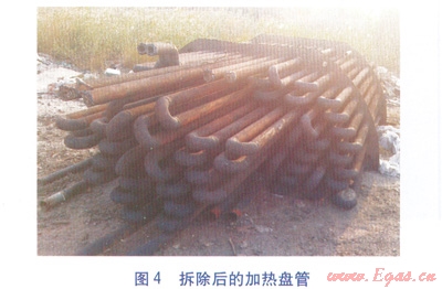 污垢樣品的化學分析結(jié)果表明,污垢主要為含油性碳酸鈣等鹽類污垢,并含有少量泥沙。對摻水進行檢測后發(fā)現(xiàn),水中油質(zhì)量濃度達70~150mg/L,還含有少量的泥沙。當含油摻水在加熱盤管內(nèi)溫度不斷升高后,極易在加熱盤管內(nèi)壁形成污垢,造成加熱盤管管壁熱阻加大,介質(zhì)流動阻力增大,最終嚴重堵塞盤管,導致加熱爐無法正常運行。采用酸液清洗后,雖然加熱盤管的換熱能力有所提升,但由于加熱盤管內(nèi)摻水實際流速低(低于0.5m/s),且酸洗造成盤管內(nèi)表面粗糙,易結(jié)垢的因素并未消除,因此很快再次出現(xiàn)換熱效率下降的問題。