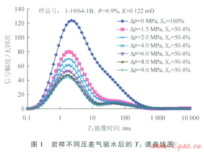 經(jīng)過成藏作用后,巖石孔隙中各類孔、喉中均有水的賦存,其賦存狀態(tài)受控于孔喉大小、形狀以及巖石表面物理性質(zhì)等[12],對于氣藏儲層來說,一般在細(xì)小孔喉處賦存的水較多。通過巖樣飽和水后進(jìn)行氣驅(qū)水和核磁共振實驗,分析了登婁庫組巖石中水的賦存特征。巖樣含水飽和度為100%時測試的核磁共振T2譜曲線反映的是孔隙內(nèi)全部水體積,曲線下包面積代表了巖樣的全部孔隙體積。在不同壓差氣驅(qū)水后(氣驅(qū)水過程的驅(qū)替壓差由小到大逐步增加),巖樣達(dá)到不同含水飽和度,隨著氣驅(qū)壓差的增大,巖樣含水飽和度降低,T2譜曲線下降(圖1),相鄰T2譜曲線之間的面積代表了兩條曲線對應(yīng)驅(qū)替壓力變化所引起的可動流體變化量,因此由相鄰T2譜曲線之間的面積分布及大小可看出可動水來自哪些孔隙及總量多少[13]。