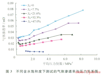 前人研究表明[14-16],致密砂巖中由于復(fù)雜的孔隙結(jié)構(gòu),氣體滲流存在非達(dá)西特征。筆者通過氣驅(qū)水實驗分析表明,當(dāng)驅(qū)替壓差較小時,氣體不能驅(qū)動水形成流動,只有當(dāng)驅(qū)替壓差大于某一臨界值,足以克服水鎖產(chǎn)生的毛細(xì)管阻力才能發(fā)生流動,這在滲流曲線上表現(xiàn)為啟動壓差。對同一巖樣,其含水飽和度越高,氣體始流動所需的驅(qū)動壓差越大,氣體開始流動后,驅(qū)替壓差越大流量越大;巖樣含水飽和度越低,相同驅(qū)替壓差下流量越大。但是,壓差增大滲透率不一定變大,當(dāng)巖樣含水飽和度較高時,隨著驅(qū)替壓差的增大(平均壓力倒數(shù)減小),氣體滲透率有的增加,有的減??;當(dāng)巖樣含水飽和度較低時,隨著驅(qū)替壓差的增大(平均壓力倒數(shù)減小),氣體滲透率普遍呈先降低后增加的特點,這是因為前期主要受滑脫效應(yīng)的影響,而后期,當(dāng)平均壓力倒數(shù)低于一定程度后(即驅(qū)替壓差大于一定值后),這時氣體帶動部分孔隙中的水流動,或使孔隙壁的水膜變薄,氣體滲流通道增加。因此氣體滲透率開始增加(圖3)。含水飽和度越高,這種水的可動性對氣體滲流的影響越明顯。